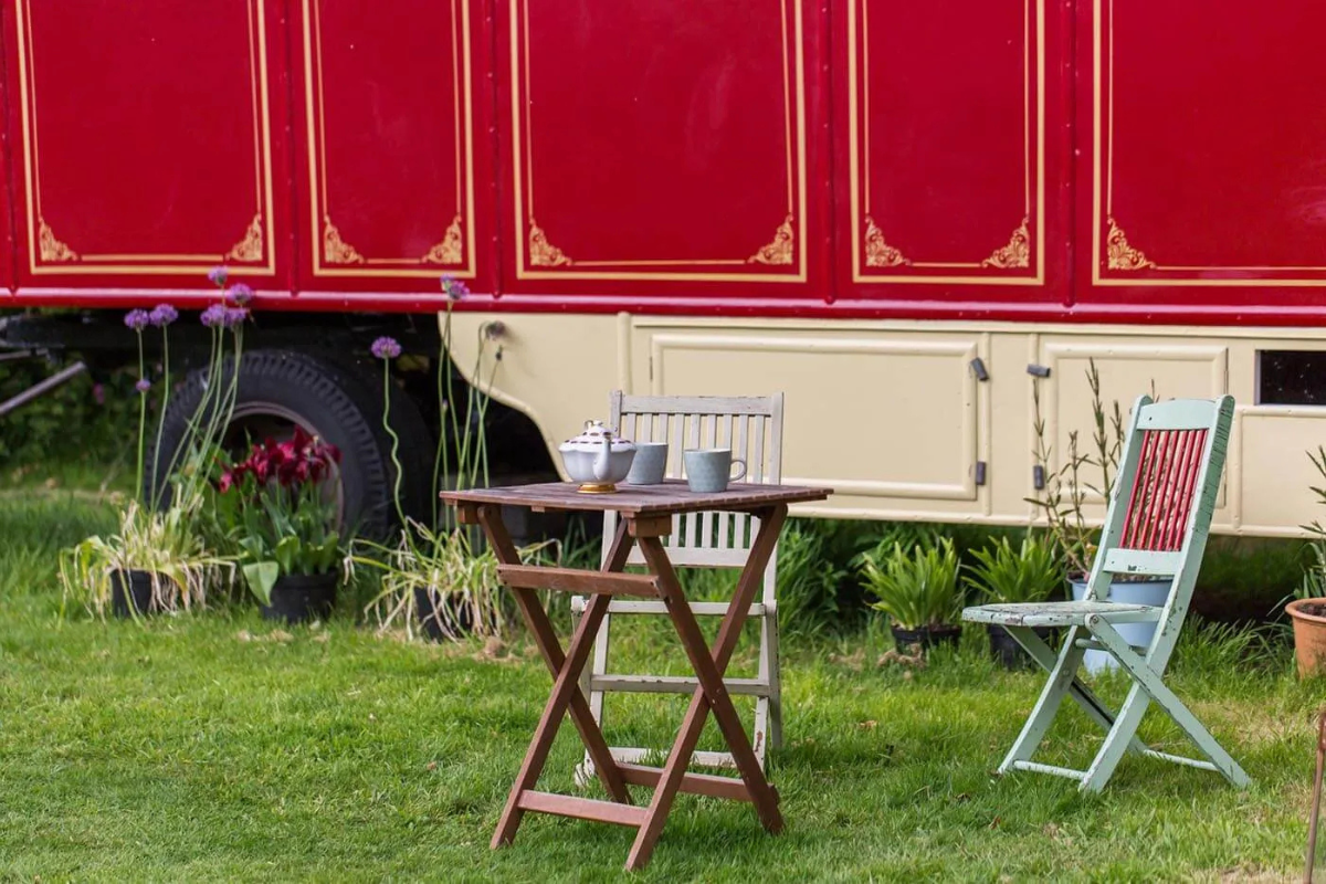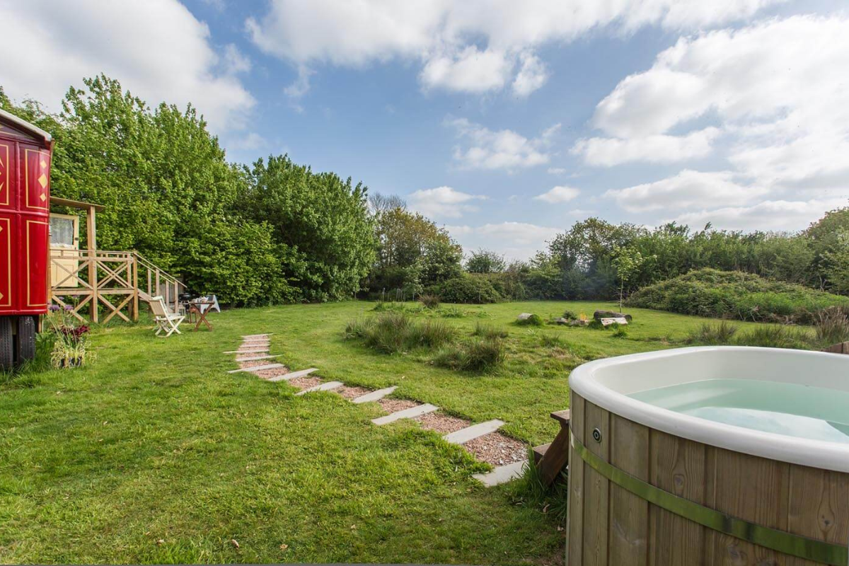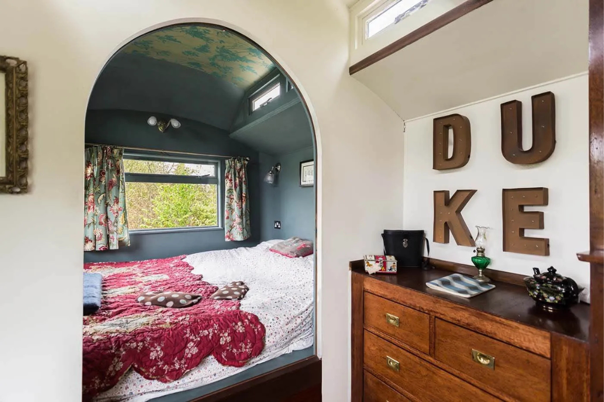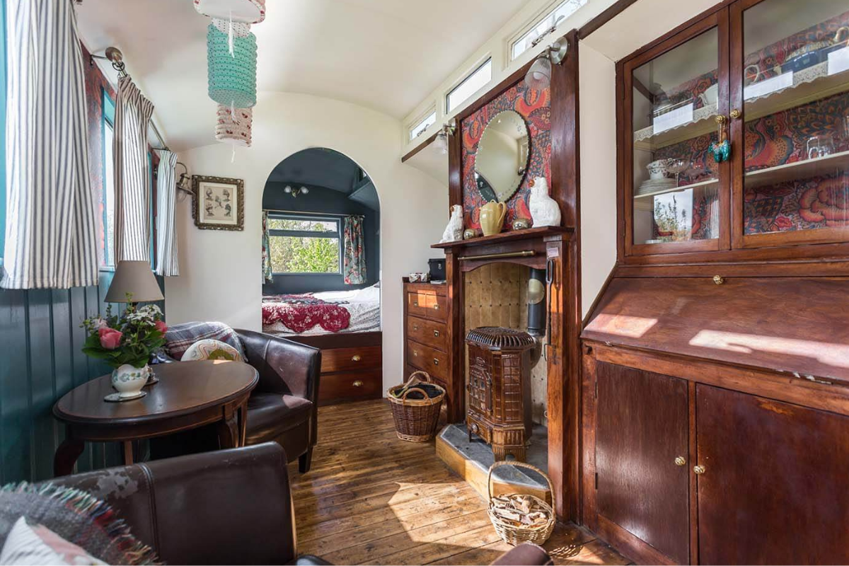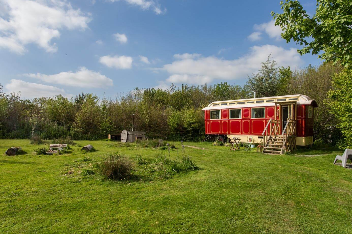 Duke is a classic 1940s Showman’s wagon, adorned with vibrant paintwork and matching interior furnishings. He presides over a secluded wildflower meadow, bordered by a mixed native hedgerow that teems with wildlife. The fire pit and hot tub in front of the wagon create a perfect setting for cozy evenings spent watching rabbits, listening to birds, and gazing at the stars. Climb up the wide wooden steps and enter through the stable door to discover a wonderfully vintage living area with a French enamel wood burner and an original built-in china cupboard. Your cozy bedroom is at one end, and a fully equipped kitchen at the other is ideal for your morning cuppa. Just a few steps away, you have your own bespoke hut with a spacious modern bathroom. The entire meadow invites you to lie back and daydream in the Cornish countryside.
