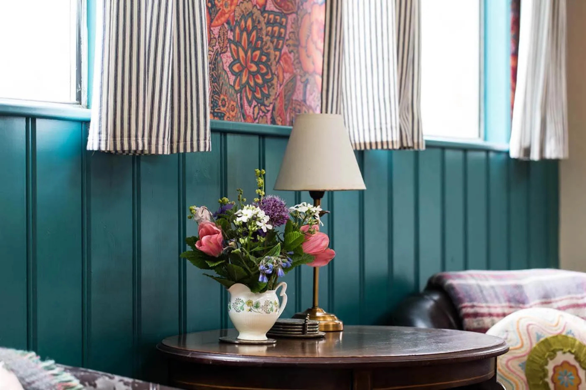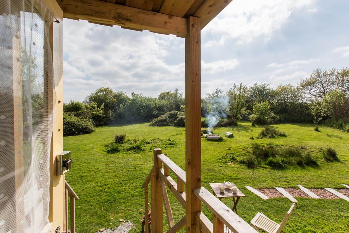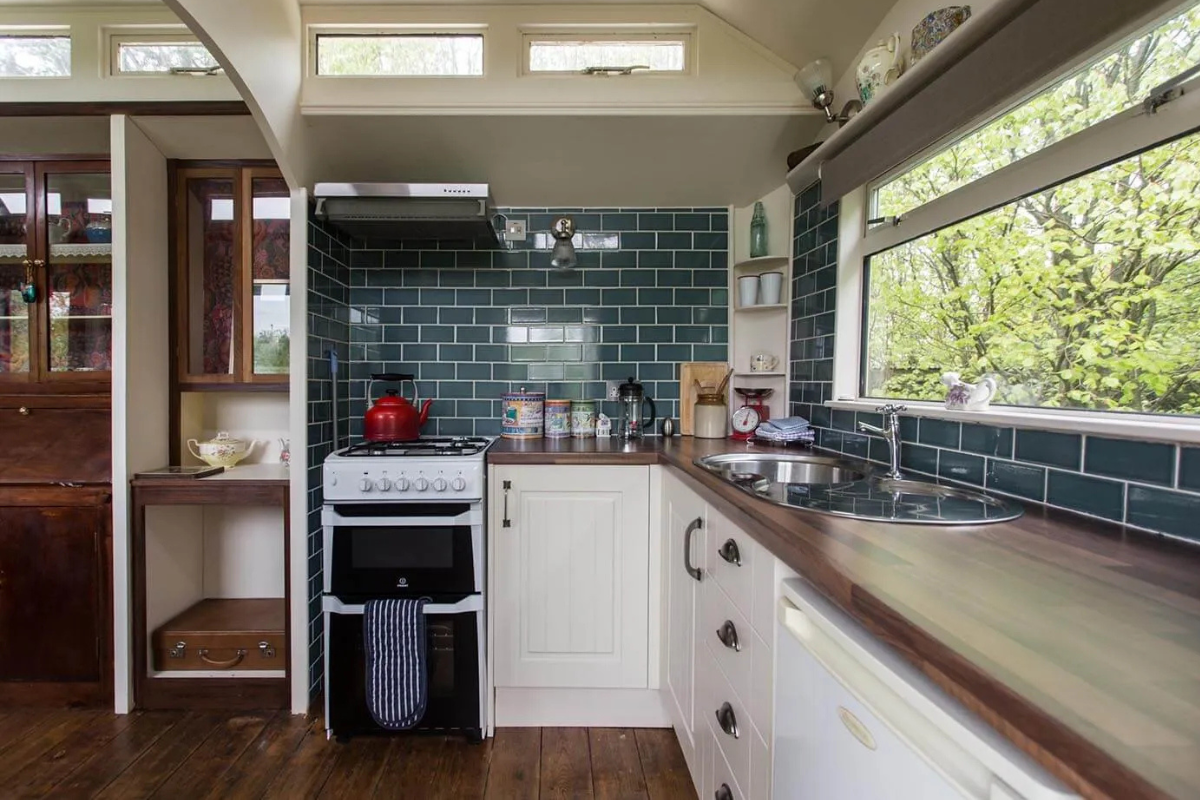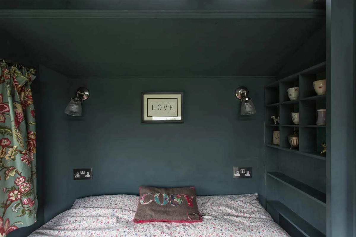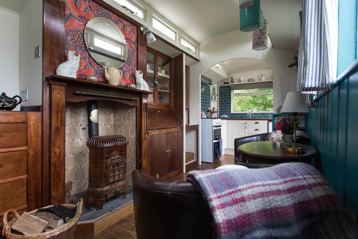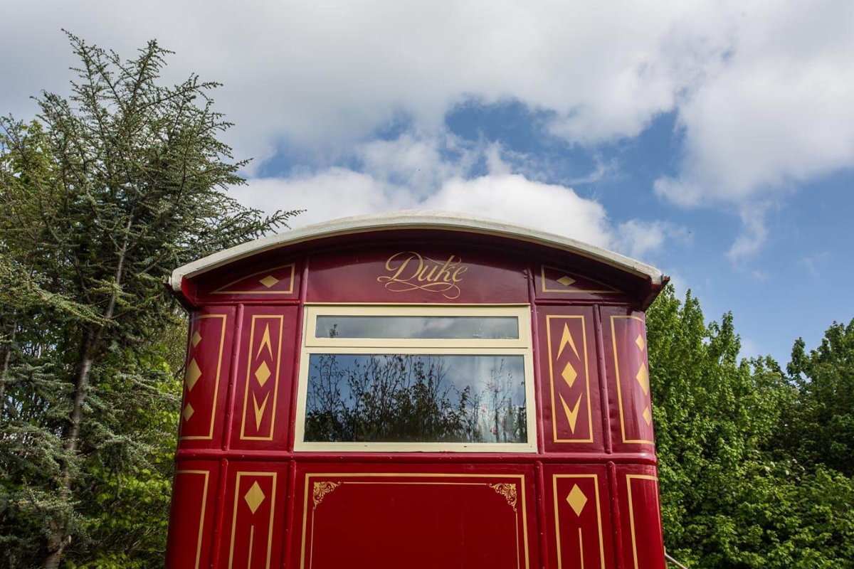 Duke is a classic 1940s Showman’s wagon, adorned with vibrant paintwork and matching interior furnishings. He presides over a secluded wildflower meadow, bordered by a mixed native hedgerow that teems with wildlife. The fire pit and hot tub in front of the wagon create a perfect setting for cozy evenings spent watching rabbits, listening to birds, and gazing at the stars. Climb up the wide wooden steps and enter through the stable door to discover a wonderfully vintage living area with a French enamel wood burner and an original built-in china cupboard. Your cozy bedroom is at one end, and a fully equipped kitchen at the other is ideal for your morning cuppa. Just a few steps away, you have your own bespoke hut with a spacious modern bathroom. The entire meadow invites you to lie back and daydream in the Cornish countryside.